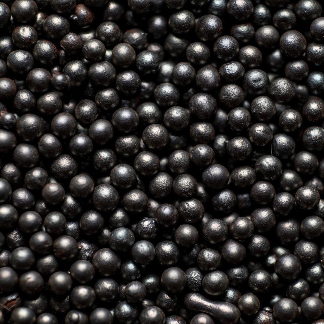 Grey metal spheres used in airless and pneumatic wheel blast machines
